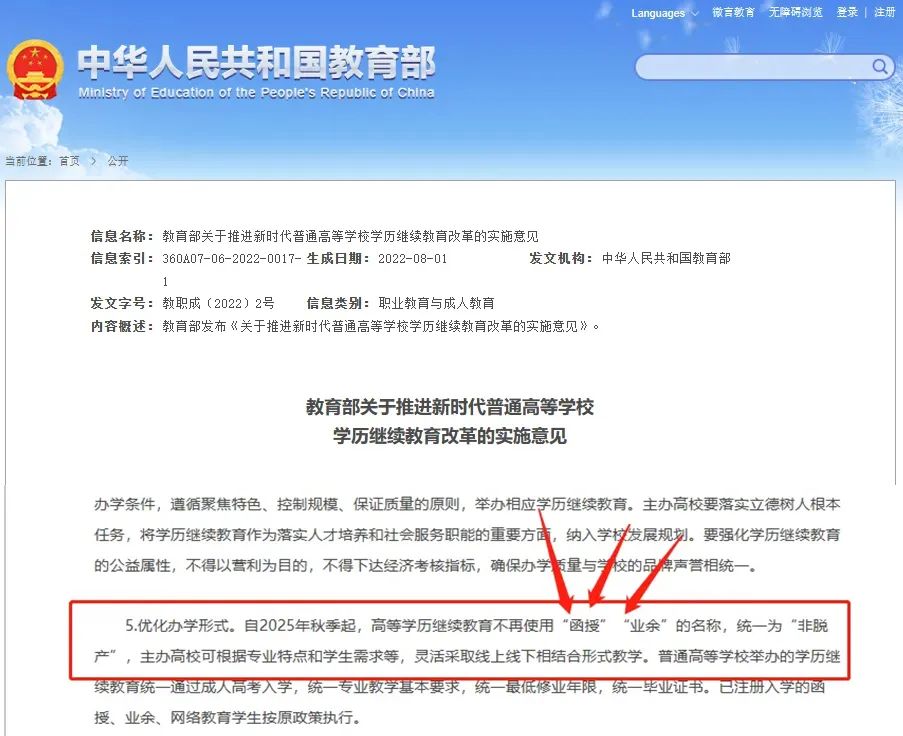 自2025年秋季起,成人高等學(xué)歷繼續(xù)教育不再使用“函授”“業(yè)余”的名稱,統(tǒng)一為“非脫產(chǎn)”。 已注冊(cè)入學(xué)的“函授、“業(yè)余學(xué)生按原政策執(zhí)行。